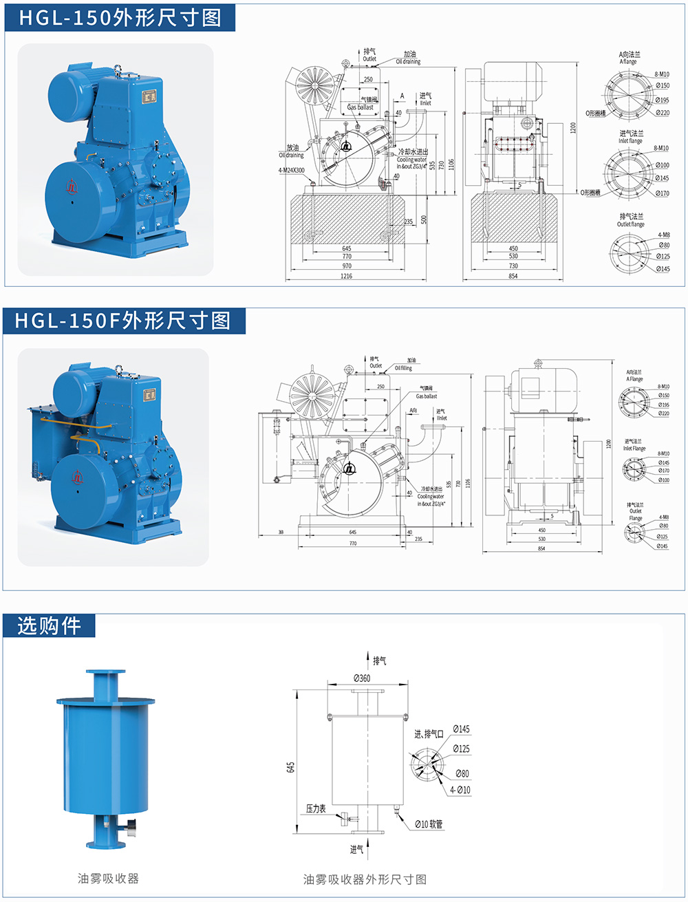 Rotary piston vacuum pump is suitable for pumping air and other ordinary gases, when a gas ballast valve is used it can also pumpcondensable gases. The pump must be filted with appropriate accessories if gas is rich in oxygen, explosive, corosive to ferrous metalchemical reactive with vacuum pump oil. The HGL, HG pump can be operated singly or as a backing pump combined with other higfvacuum pump, such as difusion pump and oil booster pump. lt is widely used in the industry of vacwum coating, vacuum heattreatment, vacuum impregnation, vacuum smelting, vacuum drying, molecular distilation and alitude simulation testing.